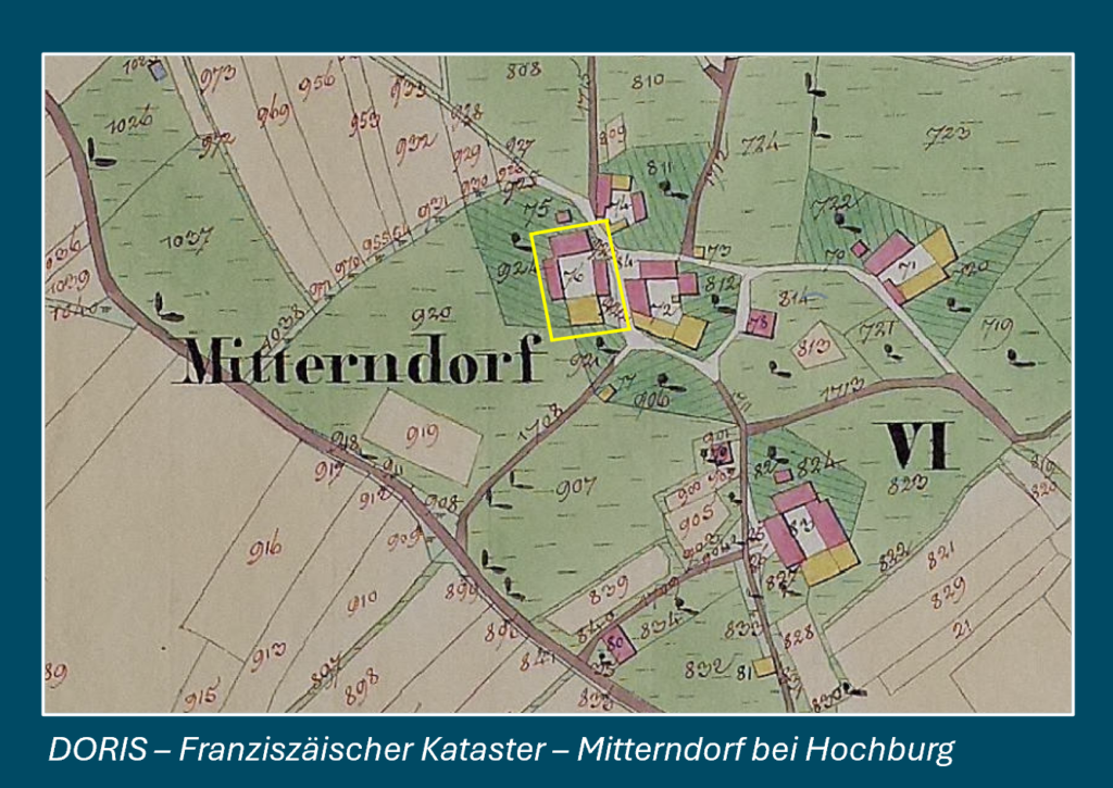 Der österreichische Föderalismus beschert uns 9 unterschiedliche GIS-Systeme, die in ihrer Darstellung konsequenter- und hilfreicherweise auch immer an der Landesgrenze enden. (Technisch dürfte die Anzahl der Plattformen darunter zwar geringer sein, schildbürgerlich bleibt es m.E. dennoch). Oberösterreich verfügt in seinem GIS-Ableger „DORIS“ allerdings über ein spezielles, für Ahnenforscher sehr spannendes Thema: „Hofnamen und Häusergeschichte“. Und dieses Thema hilft uns, das genannte Österbauer-Gut in der Ortschaft Mitterndorf unweit von Hochburg zu identifizieren. Im Haus gegenüber – dem Forsthubergut – ist übrigens 1818 ein Simon Österbauer gestorben. Doch mit einem Geburtsjahr von 1760 kann er nicht der Trauzeuge von 1731 gewesen sein – aber vielleicht sein Sohn?