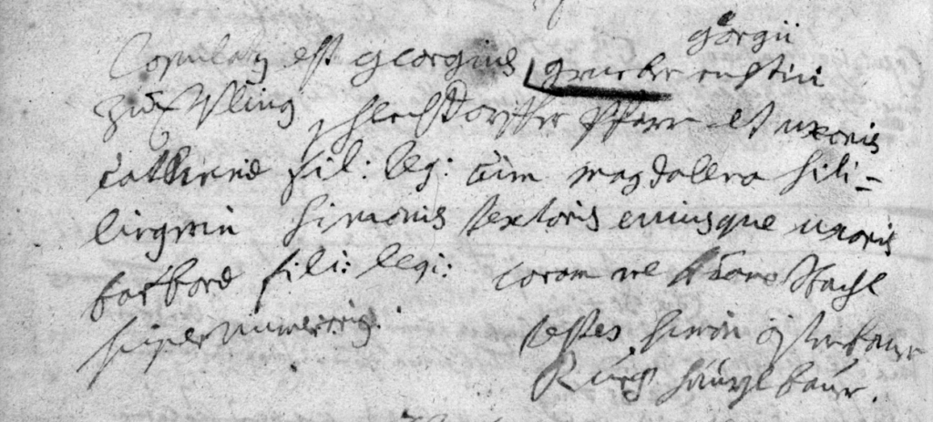 Geburten knapp nach der Trauung erscheinen sehr wahrscheinlich, im Taufbuch 1 ist allerdings nur eine vor 1739 (Magdalena, 1737) zu finden. Diese Geburt bestätigt uns Stand und Wohnort als „Wöber und Inwohner bey dem Österbauer“. Georg Gruber I + II scheinen allerdings aus einer anderen Pfarre zu stammen, die Ortsangabe bei der Trauung liest sich wie „zu Esling schle(c)htorffer pfarr“.